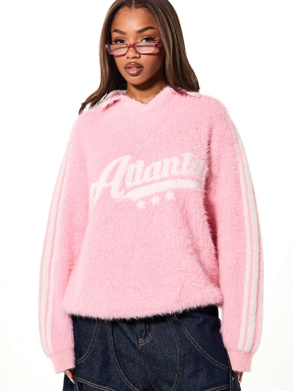 SUMWON WOMEN Oversized Drop Shoulder Fluffy Knit Top With Contrast Stripe Detailing And Script Print For Winter Casual Style