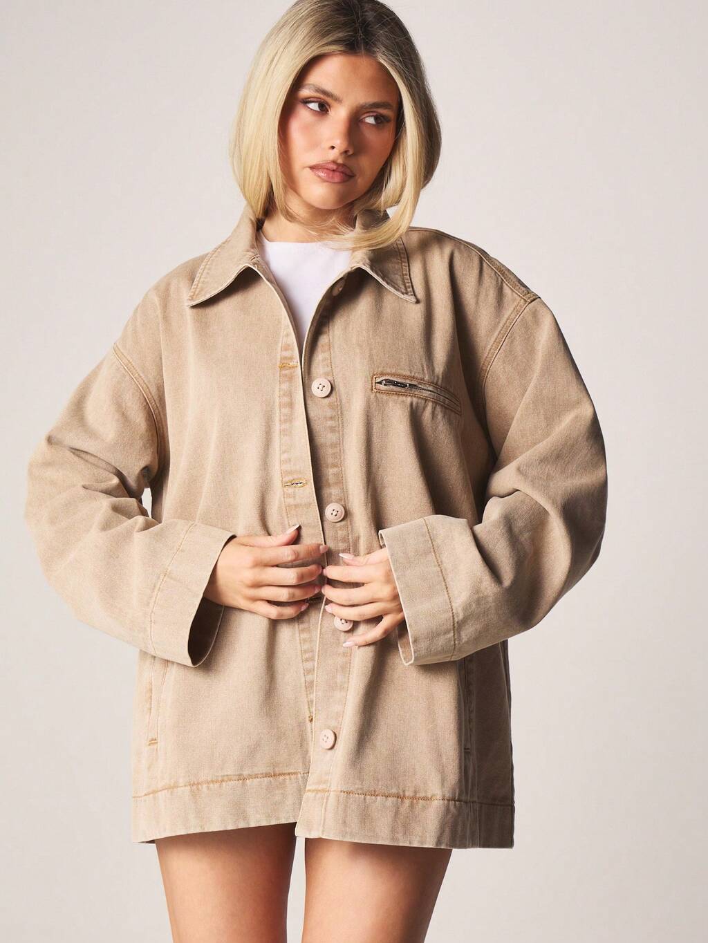 KIZN Dark Wash High Neck Denim Jacket With Contrast Stitching And Button Front Detail For Layering