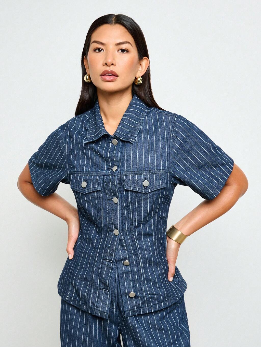 AiiRZ Pinstripe Denim Trucker Jacket Short Sleeve Button Down Workwear Fashion Statement Summer Spring Retro Classic Outerwear