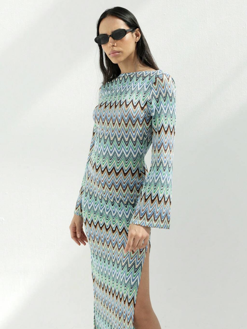 KSTM Women's Long Sleeve Zig Zag Pattern Maxi Dress With Side Slit Round Neckline Multicolor Zigzag Print Floor Length Spring Summer Dress
