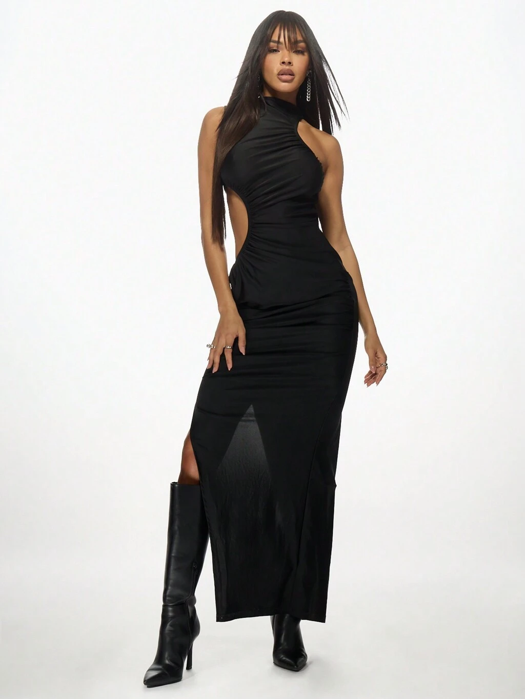 MISSGUIDED Elegant Ruched Halter Neck Maxi Dress With Side Cut-Out Detail And Side Slit