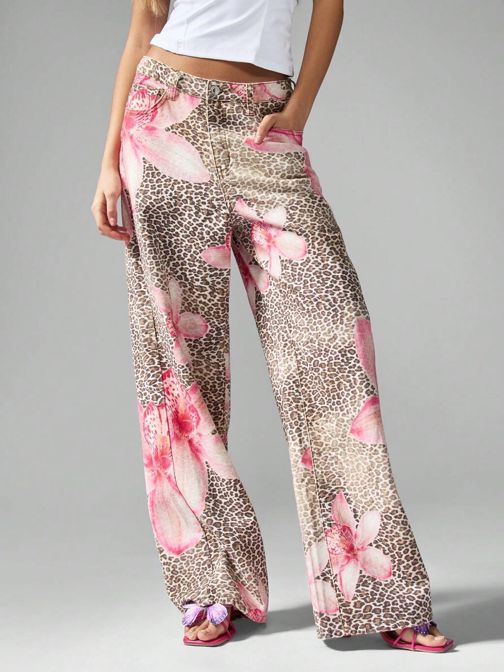 MISSGUIDED Designer Statement Wide Leg Animal Print Floral Overlay Jeans
