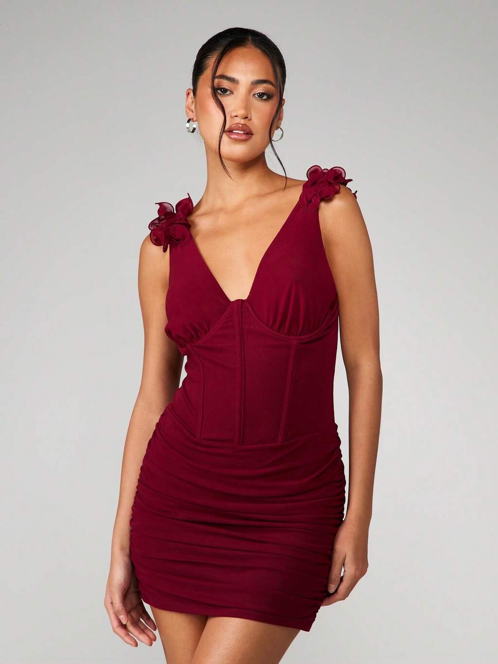 KIZN Lace Trim Corset Bodice Cami Strap Wrap Drape Mini Dress Evening Party Sleeveless Fitted Bodycon V Neck For Valentine's Day