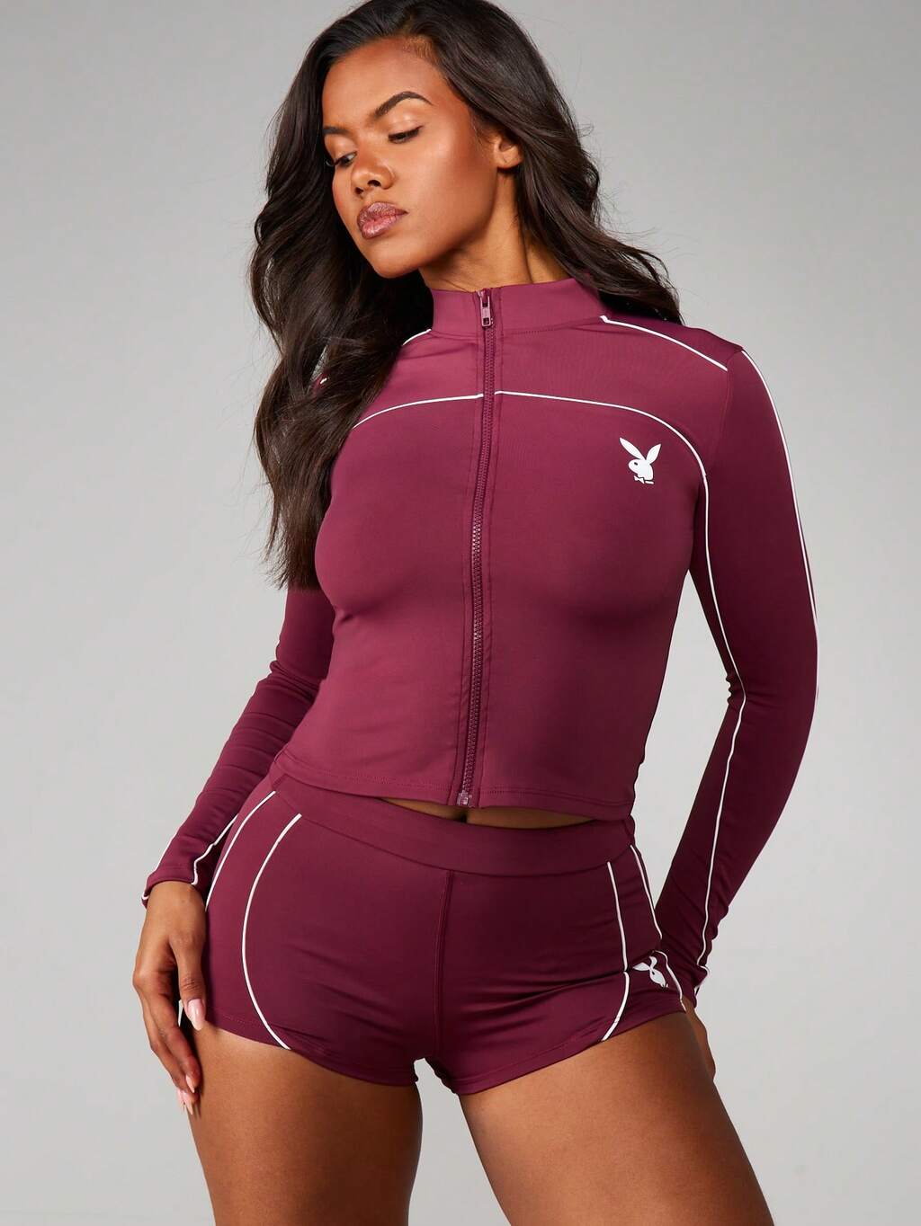 Missguided x Playboy Set aus Oberteil und Shorts mit halbem Reißverschluss