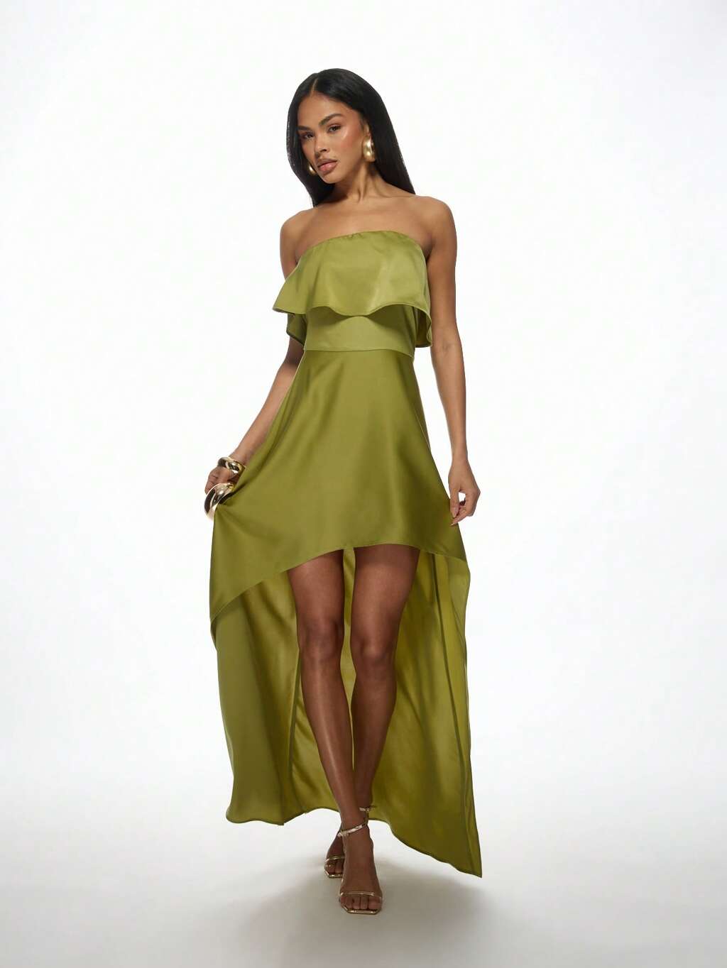 MISSGUIDED Elegantes trägerloses High-Low-Abend-Maxikleid mit Rüschenauflage