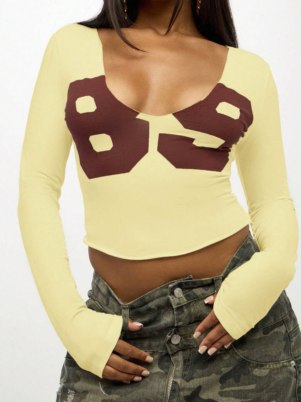 SUMWON WOMEN Baumwolle Langarm Schmetterling Design Crop Top V-Ausschnitt Vintage Y2K Mode Lässig Frühling Herbst Streetwear Ästhetik Alltags-Outfit