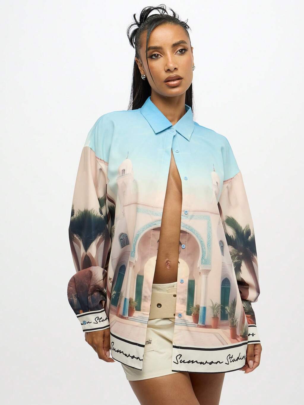 SUMWON WOMEN Luxuriöse Resort Bluse mit Langarm, Knopfleiste, Seidendruck mit architektonischem Design im Mittelmeer-Stil, Urlaubsmode für Sommer und Frühling am Strand