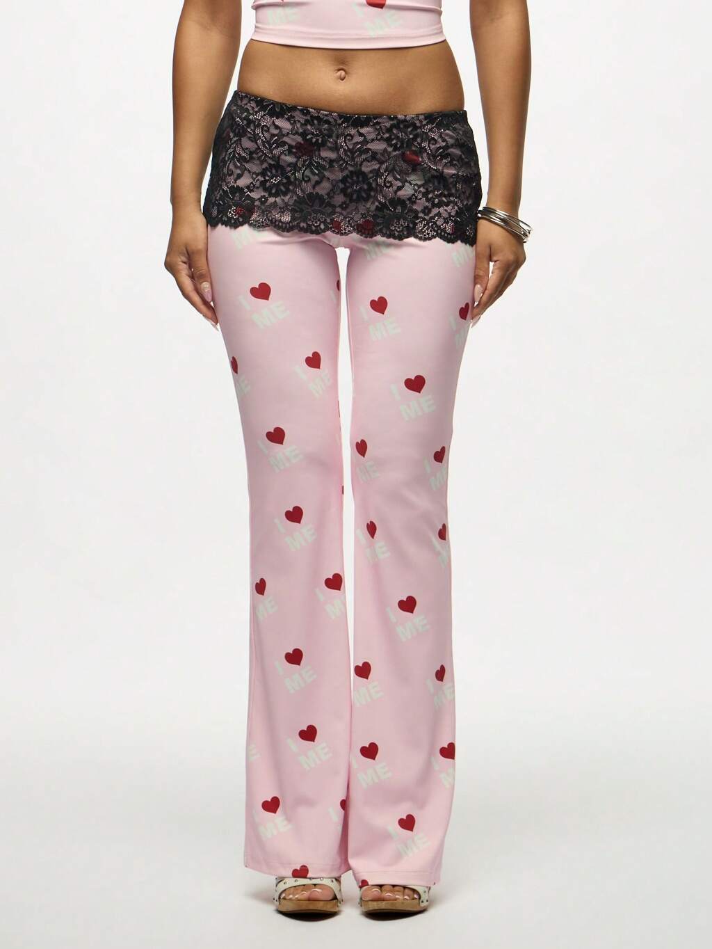 SUMWON WOMEN Rosa Herzen Muster Lounge Hose, hoher Bund, weites Bein, Spitzenbesatz, bequeme Hose mit weitem Bein im Palazzo-Stil, Urlaubsthema Valentinstag