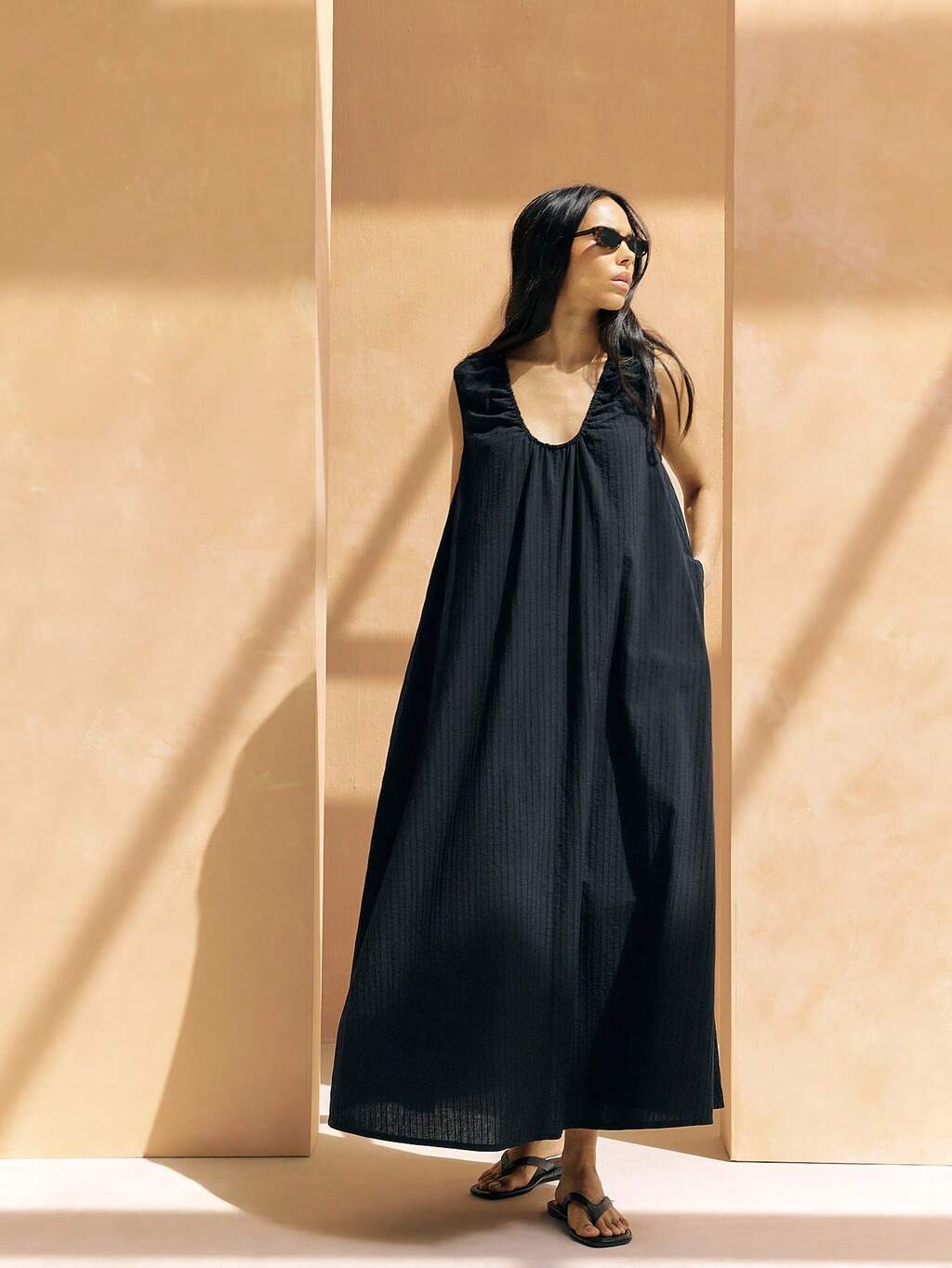 KIZN Asymmetrisches, schulterfreies, drapiertes schwarzes Maxikleid mit halbdurchsichtigem Stoff und offenem Rückendesign für Abendpartys