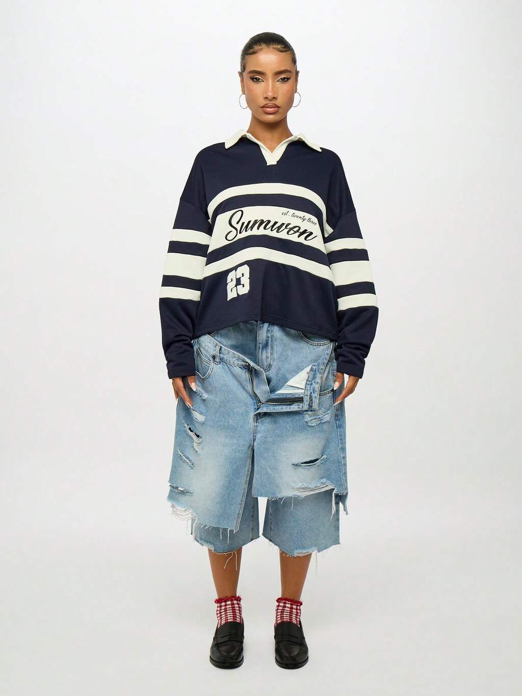 SUMWON WOMEN Oversized Varsity Trikot Langarm Poloshirt Rugby Top mit athletischem weißem Streifenprint und klassischem Kontrastkragen, Herbst-Winter Streetwear Mode Grundlage