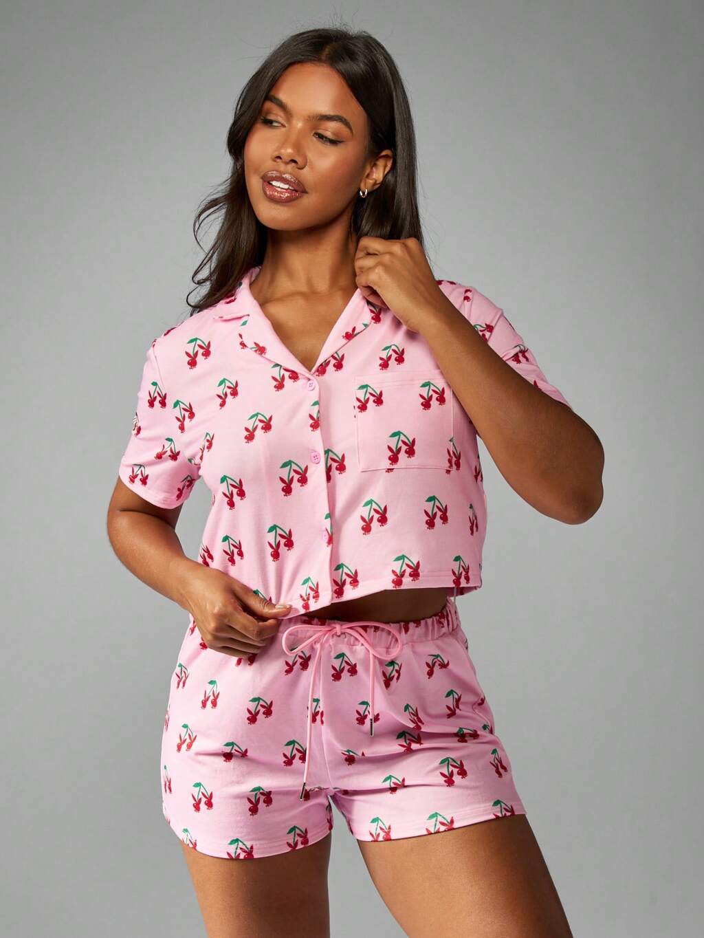 Missguided x Playboy Pyjama-Set mit Kirschen-Print, kurzärmligem Oberteil mit Knopfleiste und Shorts mit elastischer Taille