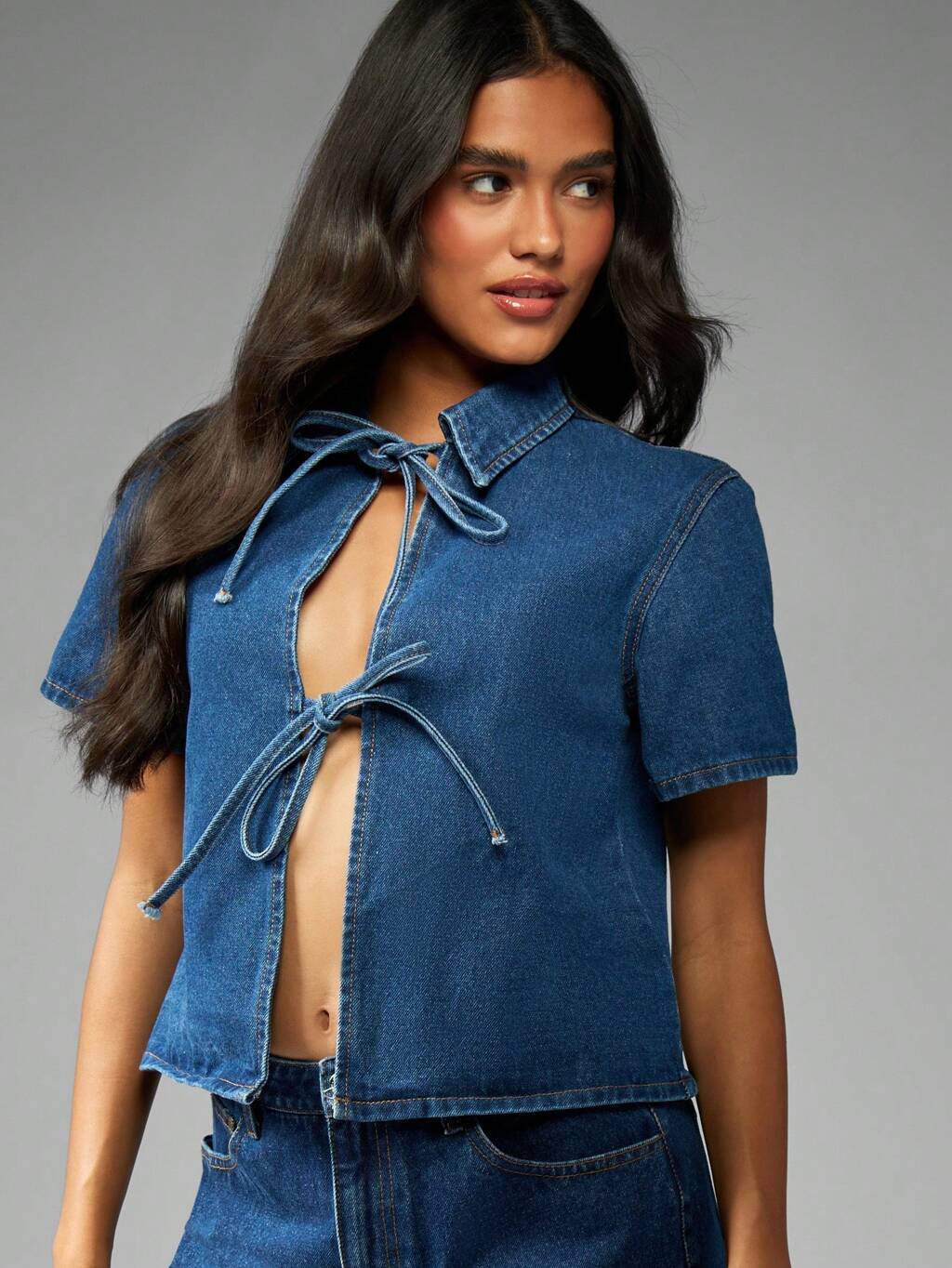 MISSGUIDED Kurzes Jeanshemd zum Binden vorn mit Cut-Out-Design