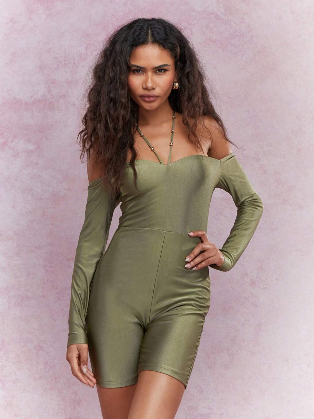 MISSGUIDED Stylischer schulterfreier, langärmliger, figurbetonter Stretch-Unitard