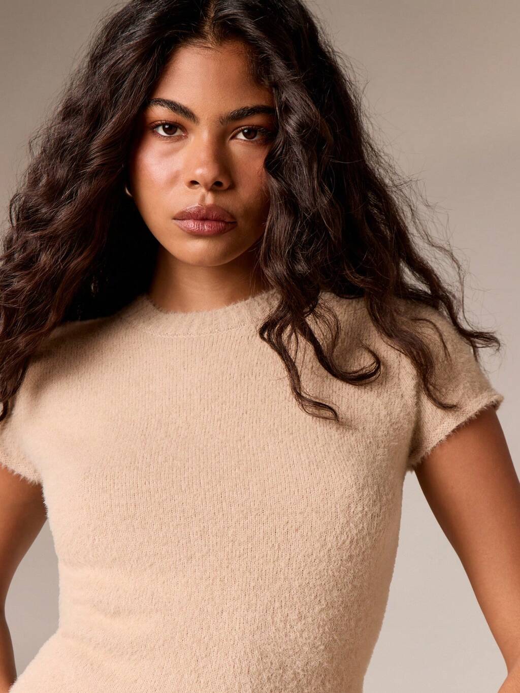 AiiRZ Flauschiger gestrickter kurzer Pullover mit Stehkragen, taillierter Rippstrick, gemütlich für Herbst und Winter, lässiger, stilvoller, minimalistischer Grundlagenessential