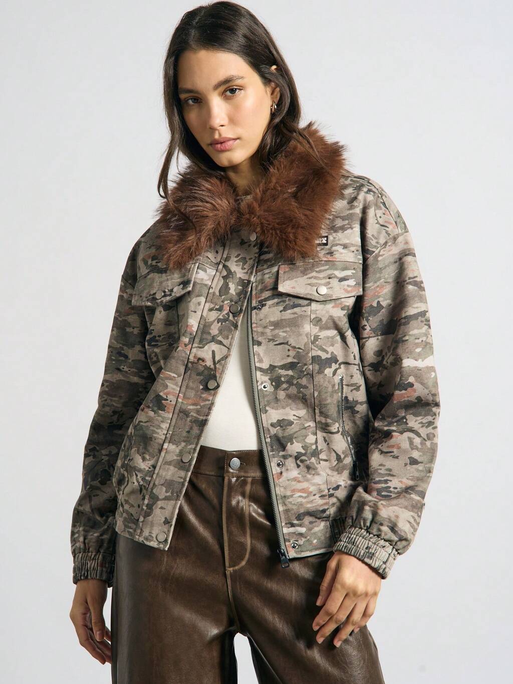 AiiRZ Gefütterte Jacke mit Pelzkragen im Militär-Kampfstil, Reißverschluss, Taschen, warmer Herbst-/Wintermantel im lässigen Streetstyle