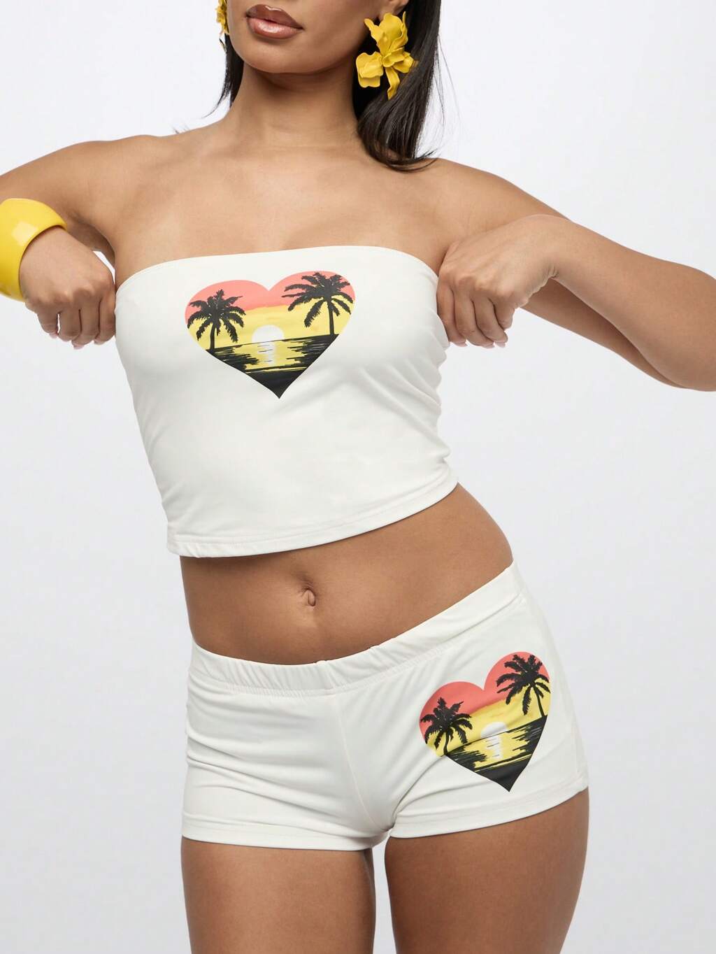 SUMWON WOMEN Tropisches Paradies Zwei-Teiler Koordinations-Set mit Herzprint Bandeau-Top und Shorts, Sommer Strand Festival Insel Urlaub Party Outfit