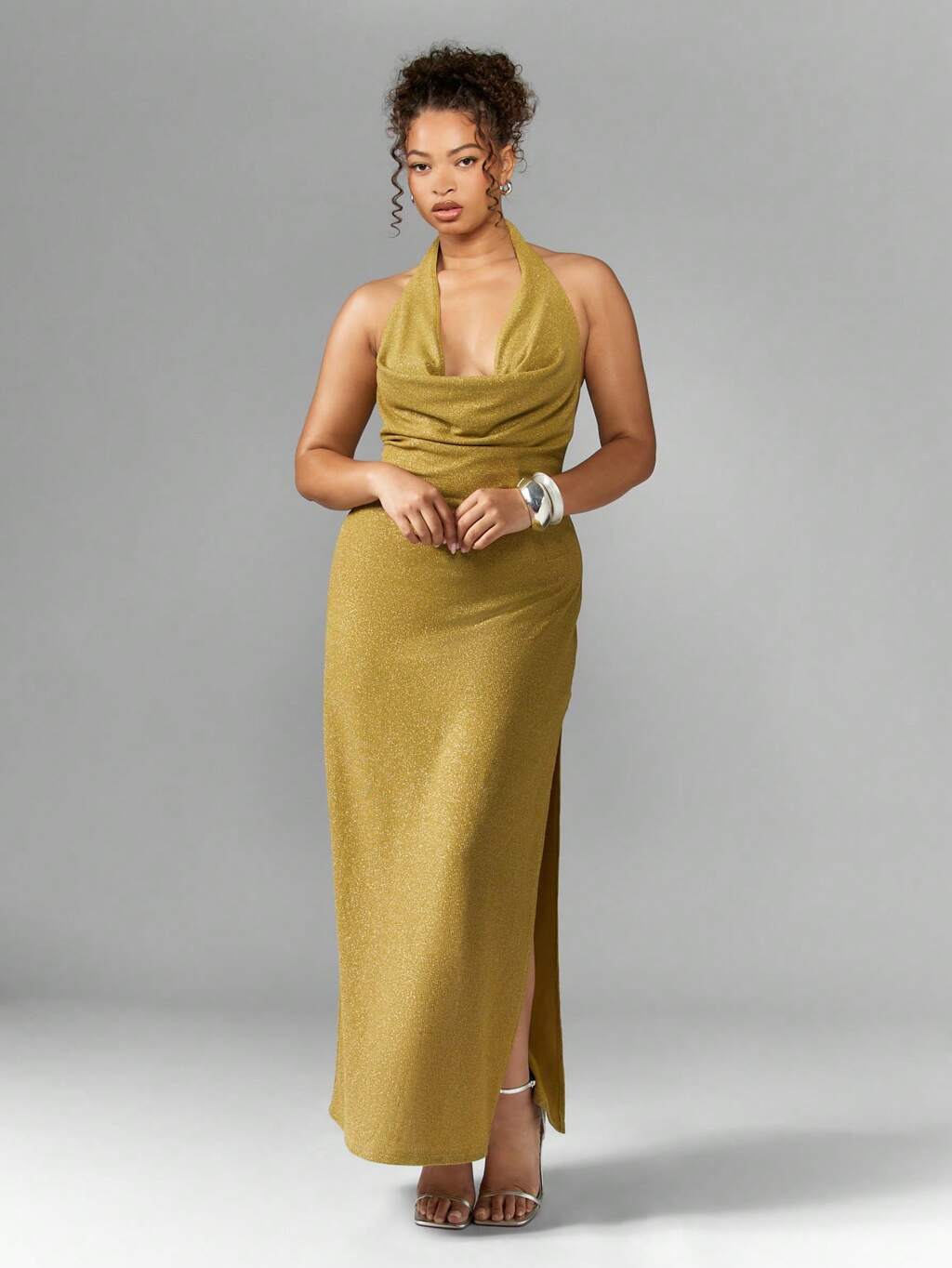 MISSGUIDED PLUS Metallic Schimmernde Neckholder-Kleider mit hohem Schlitz in Übergröße