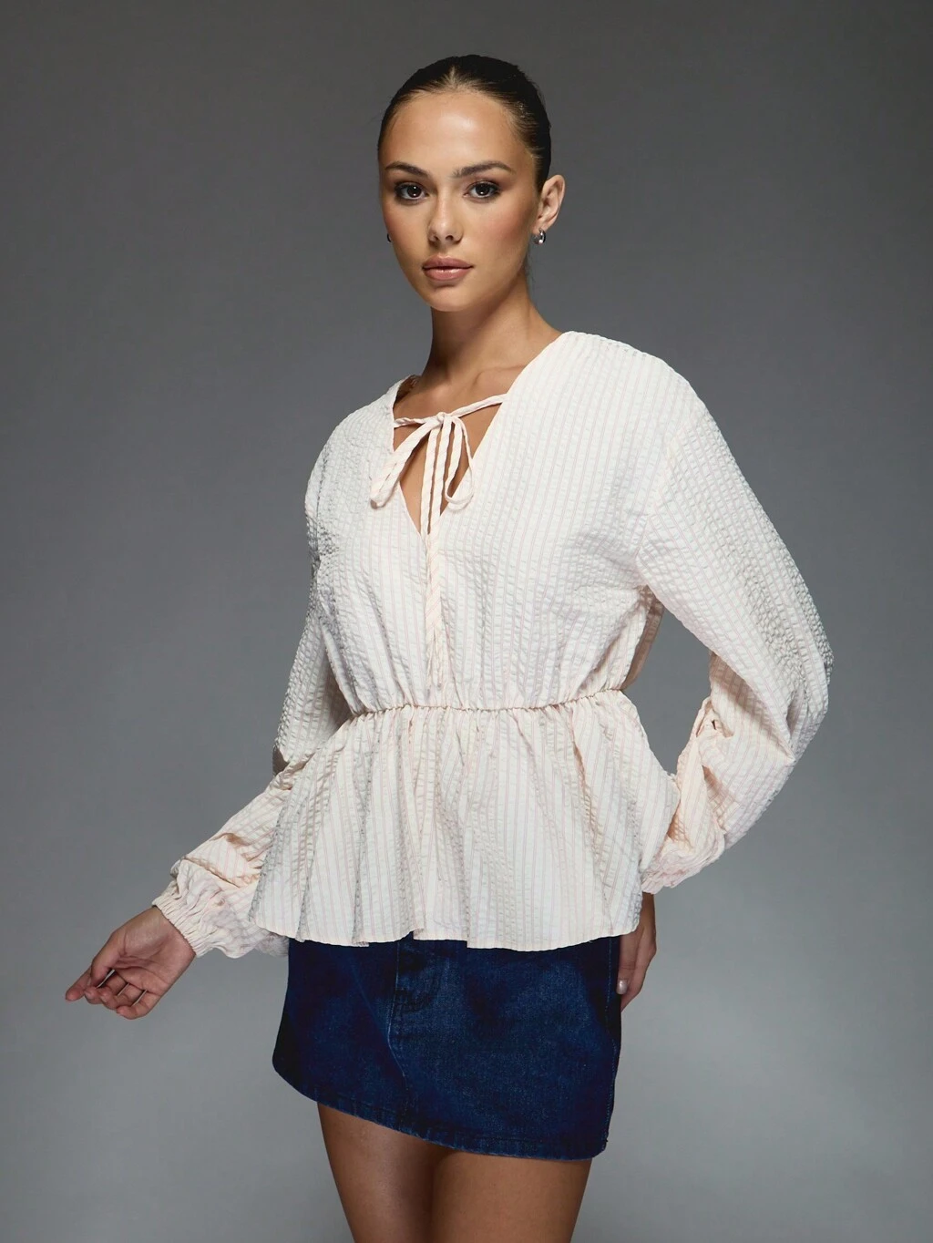 MISSGUIDED Blusa acampanada con mangas globo de algodón de rayas y volantes, con detalle de lazo delantero