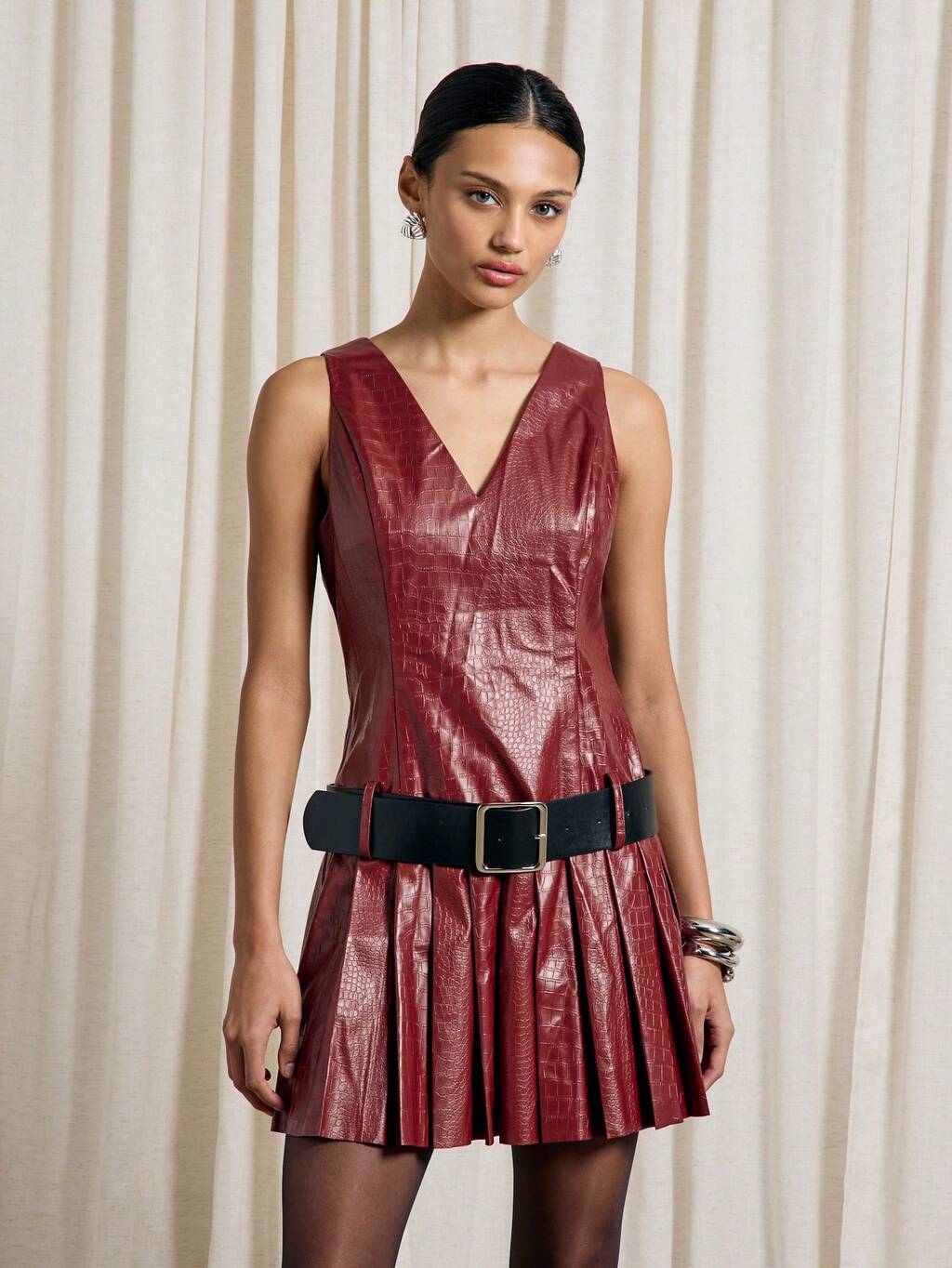AiiRZ Vestido mini con cuello en V, plisado en PU con cinturón