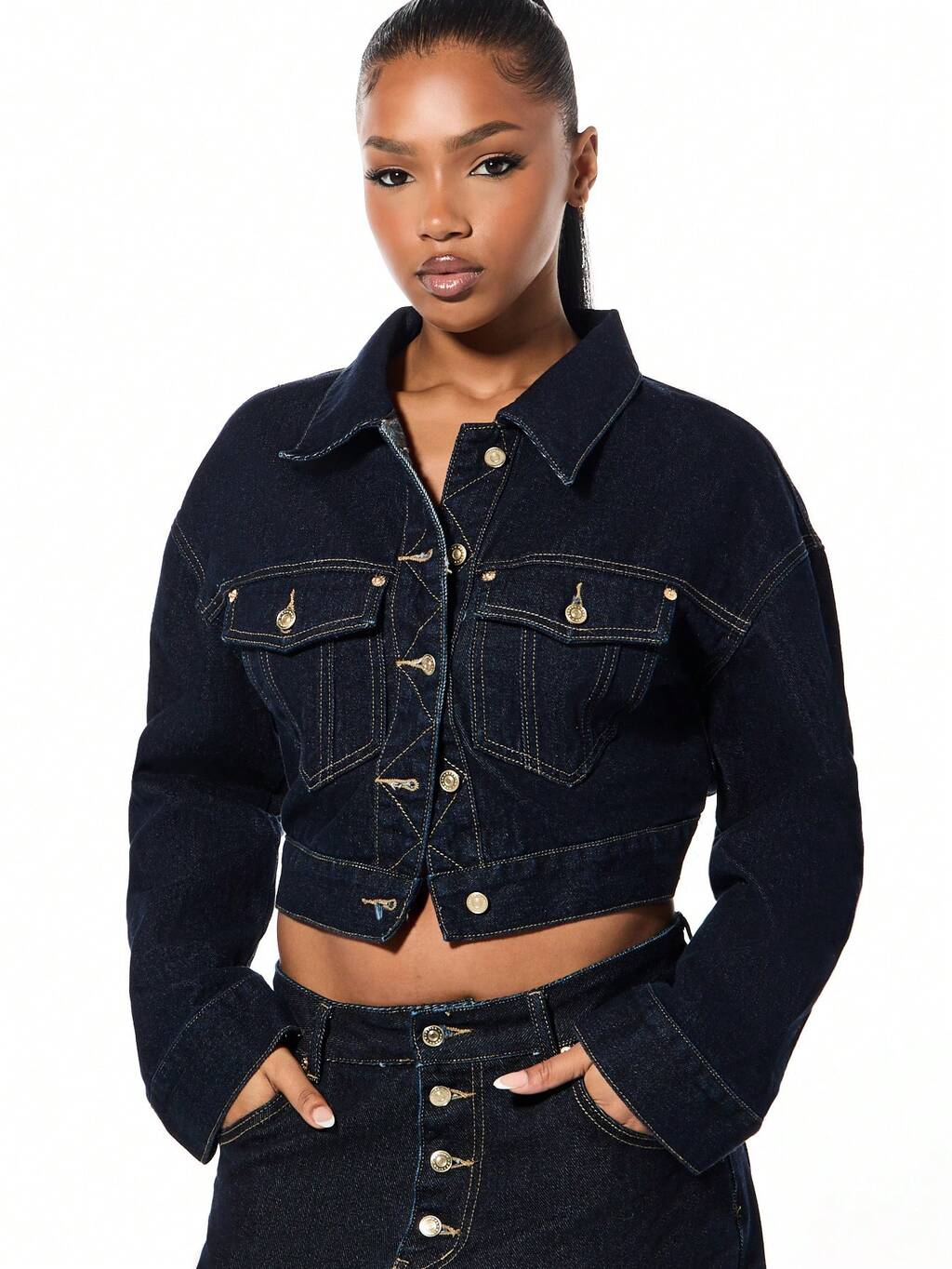 SUMWON WOMEN Chaqueta vaquera corta y oversize con detalles de botones dorados y cinturón de cintura ceñida para capas casuales