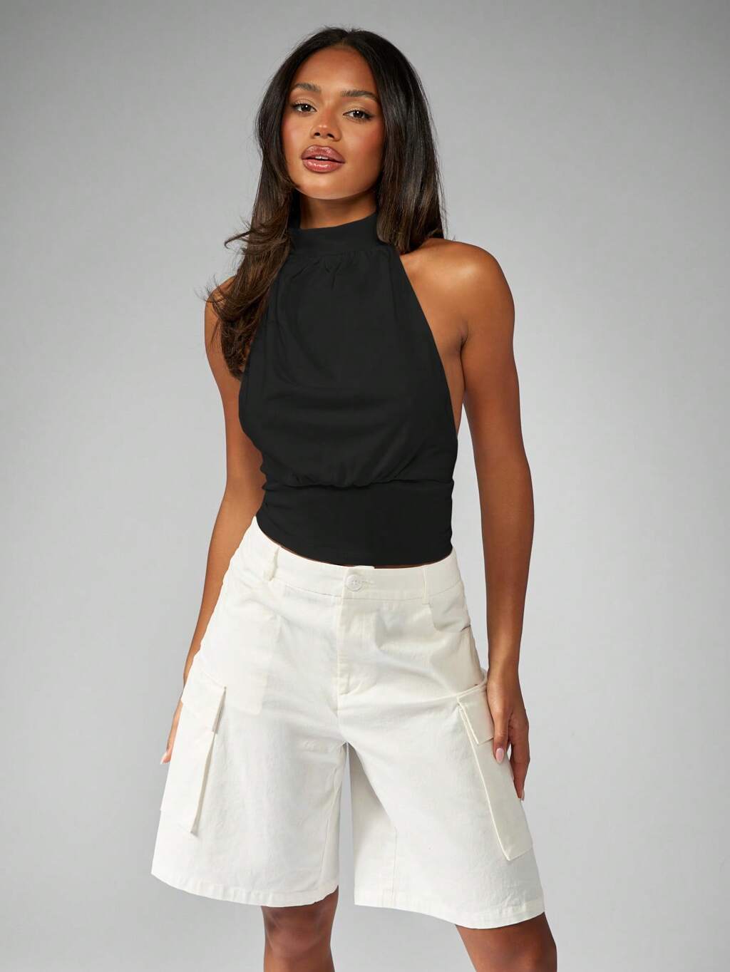 MISSGUIDED Top corto ajustado sin mangas con cuello halter fruncido