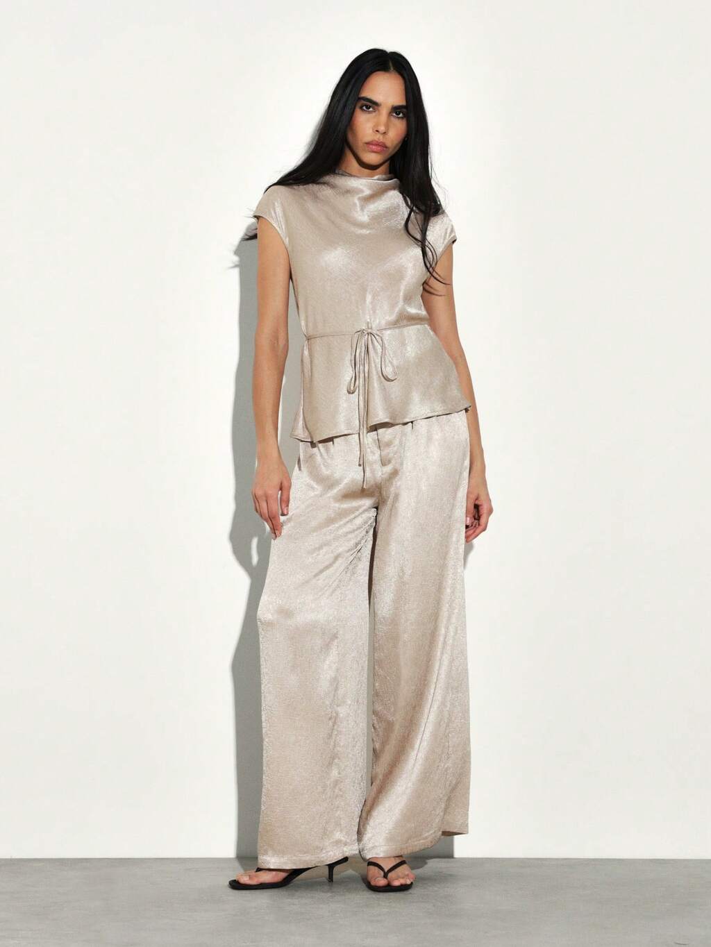 KSTM Conjunto de dos piezas de satén, conjunto de ropa de lujo con top con cinturón y pantalones palazzo de pierna ancha para ocasiones formales y fiestas por la noche