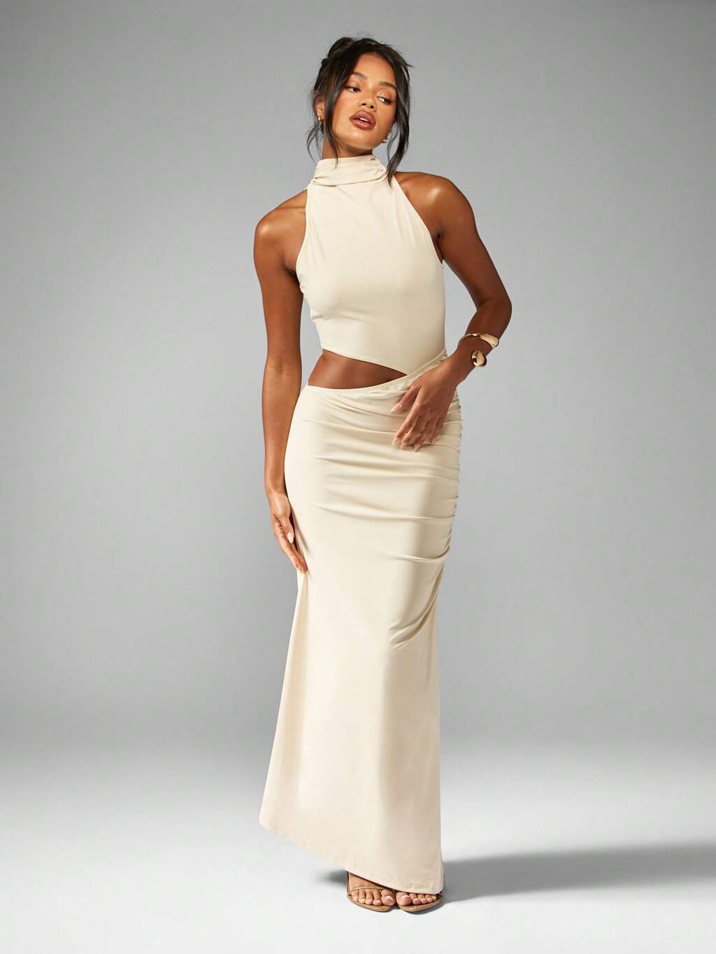 MISSGUIDED Elegante vestido largo fruncido ajustado sin mangas con cuello alto y aberturas