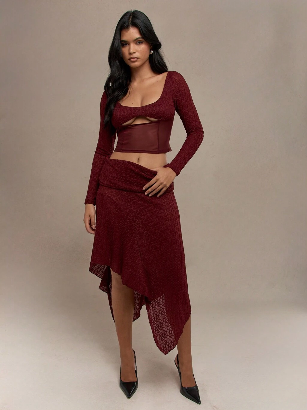 MISSGUIDED Ensemble deux pièces en coordonné composé d'un Top à manches longues texturé et transparent avec découpes et d'une jupe mi-longue asymétrique