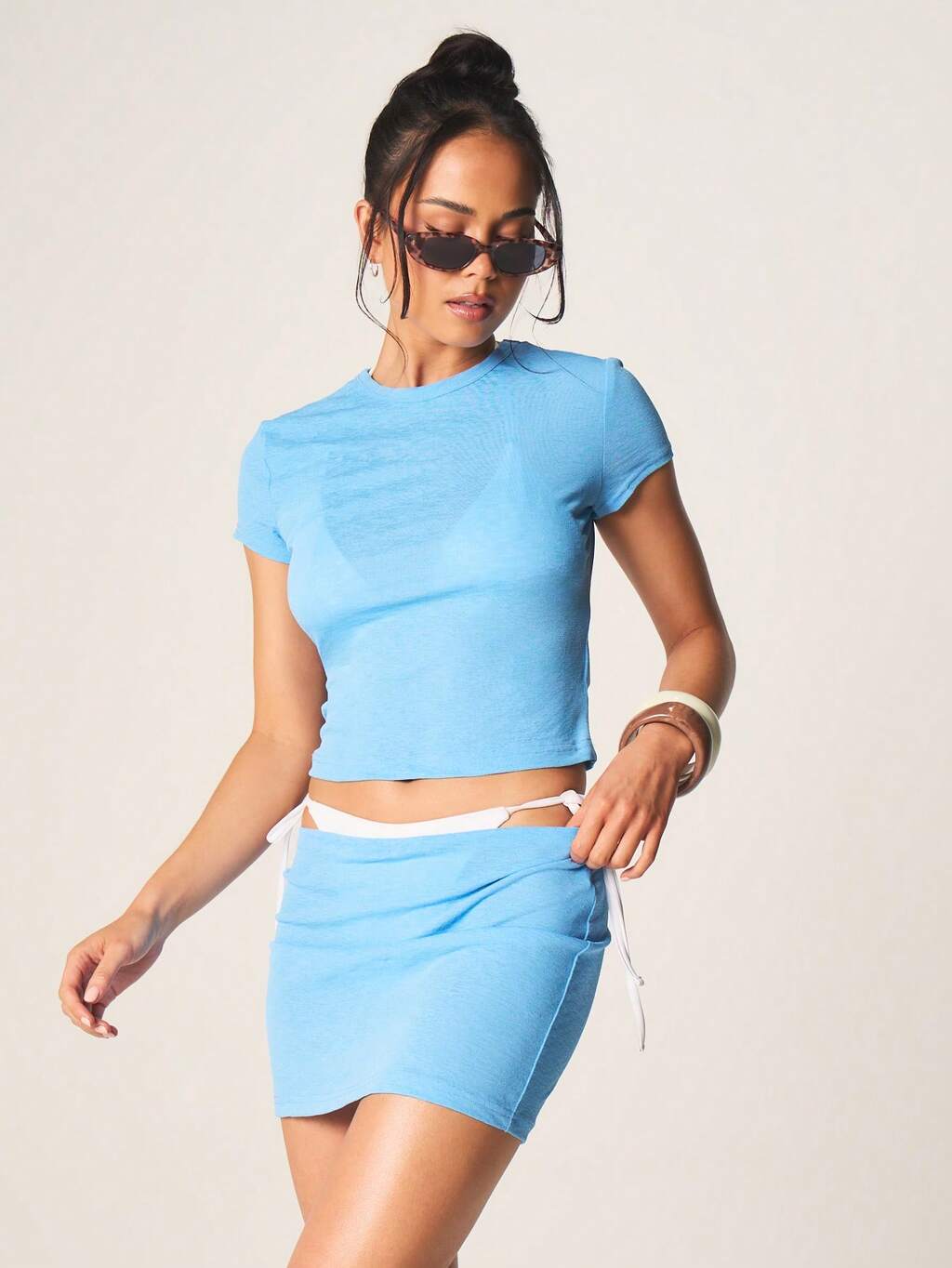 Missguided x Playboy Ensemble deux pièces pour femme, t-shirt bébé assorti, mini-jupe ajustée et cordon de serrage