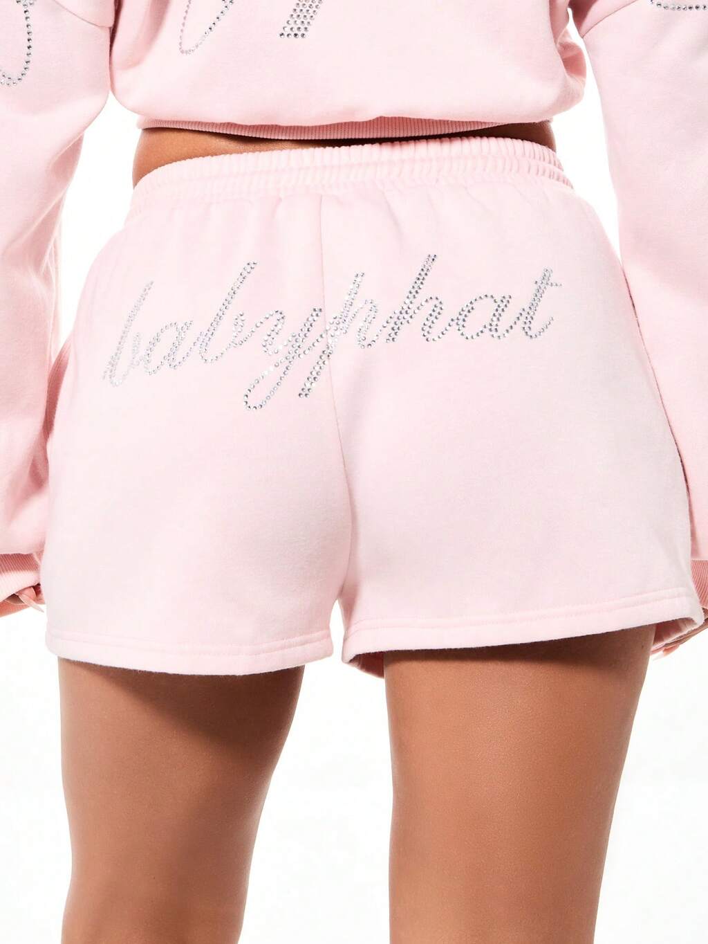 BABYPHAT Short en jersey décontracté avec cordon de serrage, détail de texte avec strass et taille élastique pour femmes