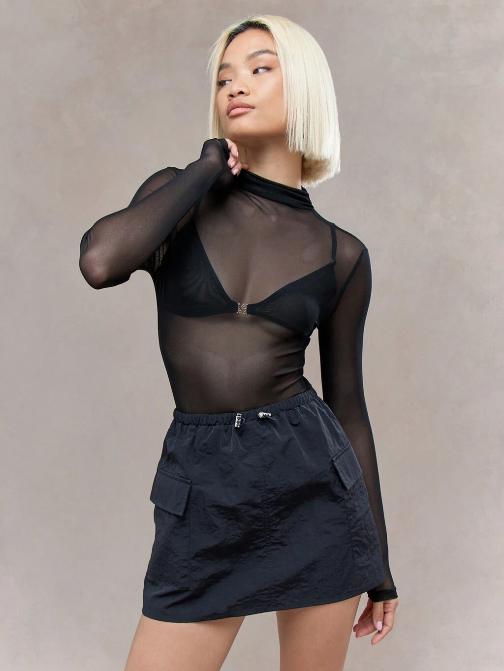 MISSGUIDED Combinaison body à manches longues col roulé en maille transparente futuriste Y2K