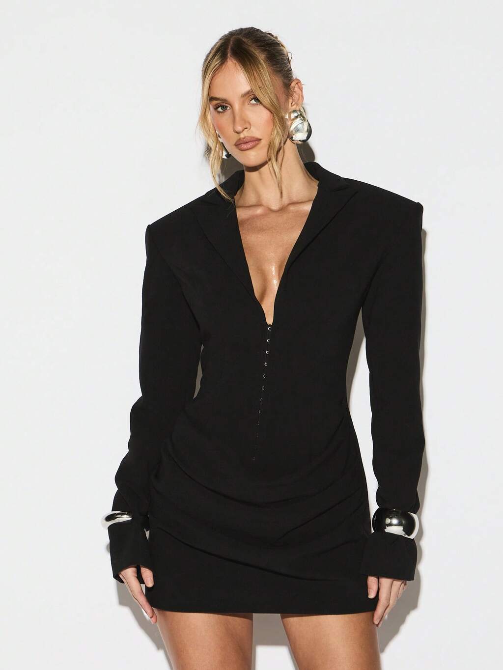 KIZN Robe moulante mini à col en V profond, manches longues, avec fermeture à crochet et œillet à l'avant et épaulettes matelassées, pour soirées et occasions spéciales
