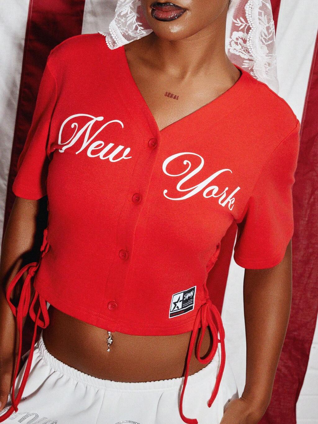 SUMWON WOMEN Top court style corset style baseball avec cordon latéral, nouveau design de maillot d'équipe sportive de rue de New York, style américain de vareuse universitaire