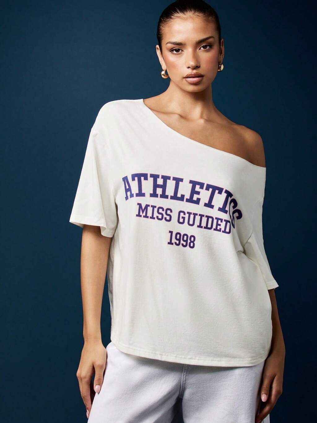 MISSGUIDED T-shirt ample à épaules dénudées et imprimé universitaire