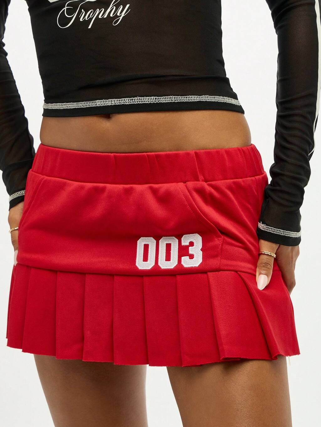 SUMWON WOMEN Jupe mini plissée style universitaire taille haute avec design de trophée. Bas de jupe patineuse pour uniforme scolaire, équipe de cheerleading, tennis. Avec application de numéro