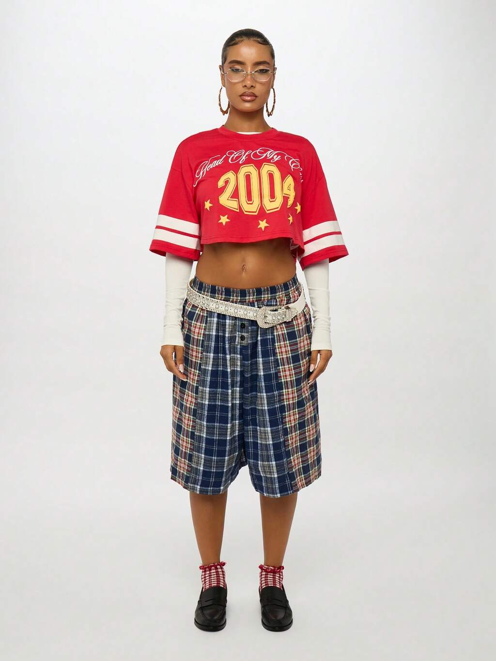SUMWON WOMEN T-shirt court à manches longues à imprimé graphique rétro Y2K 2004, style universitaire, numéro de jersey