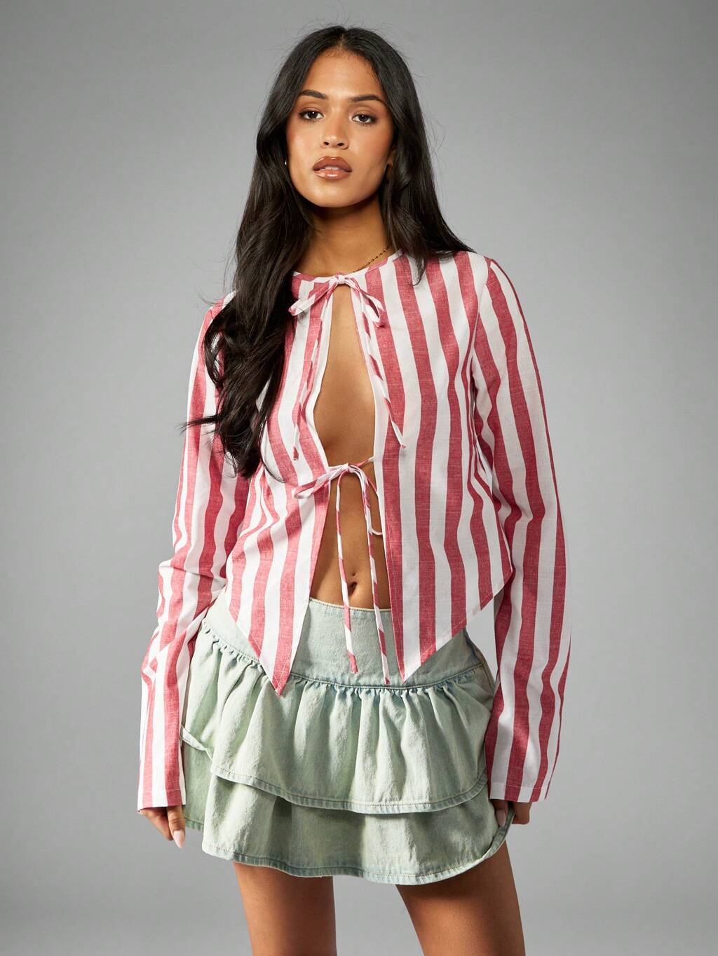 MISSGUIDED Chemisier léger à rayures verticales, manches longues, noué sur le devant, idéal pour Noël