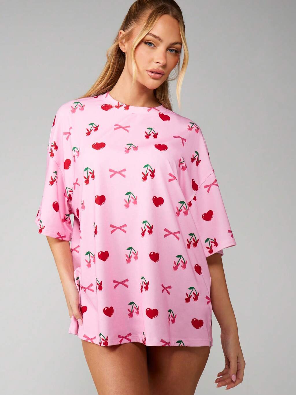 Missguided x Playboy Chemise de nuit surdimensionnée à imprimé cerises et nœuds