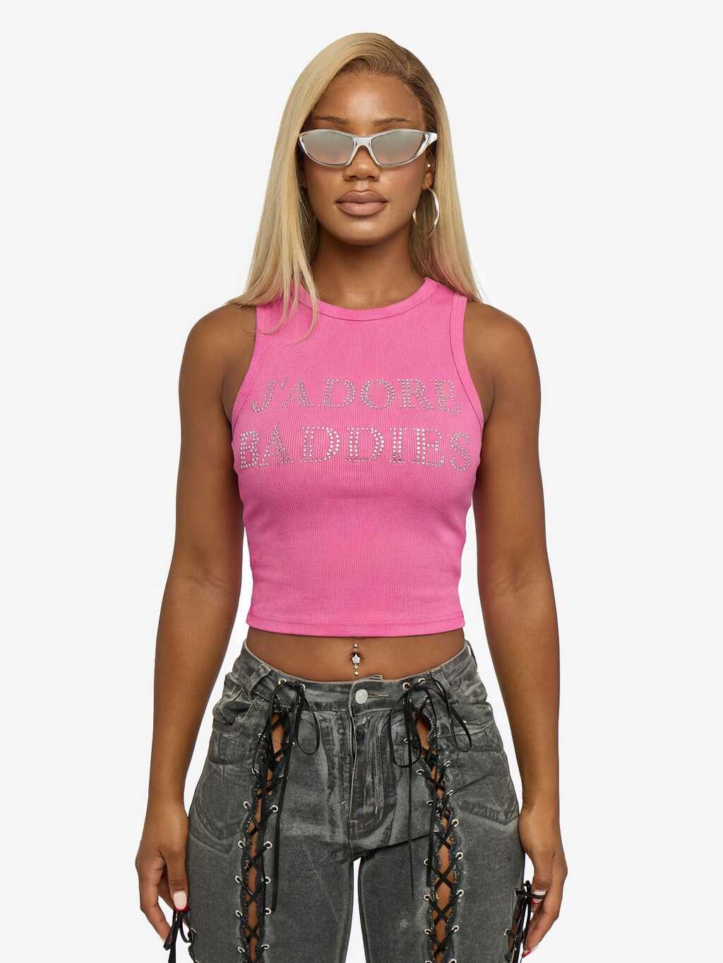 SUMWON WOMEN Débardeur court sans manches avec impression de texte en strass thermocollés, col rond côtelé, top mode d'été décontracté