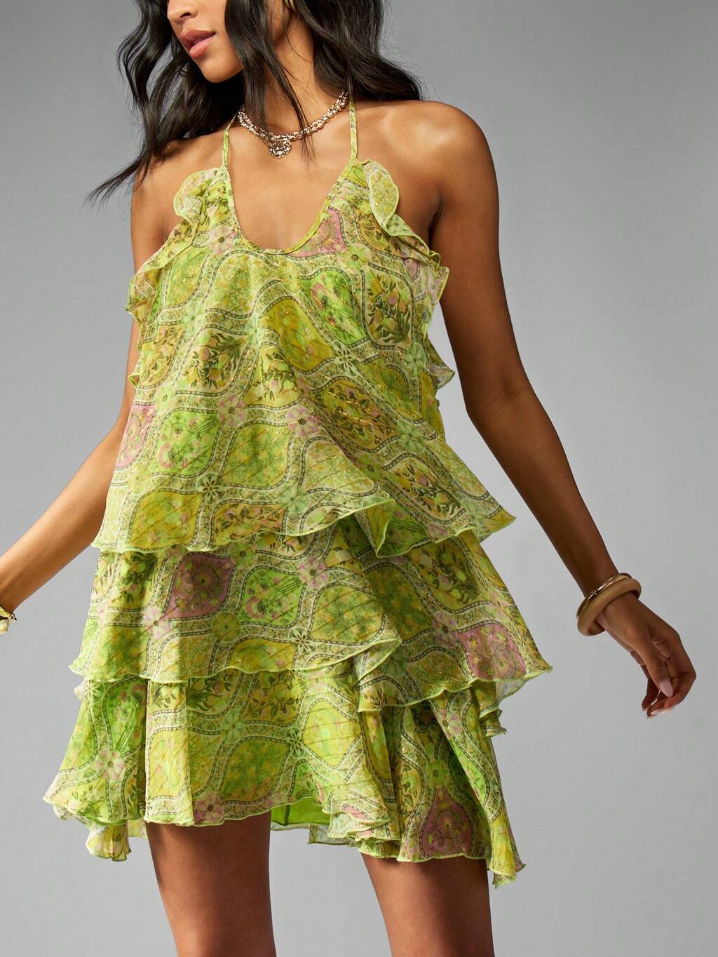 MISSGUIDED Robe courte fluide en mousseline à volants et imprimé cachemire, col licou et volants superposés