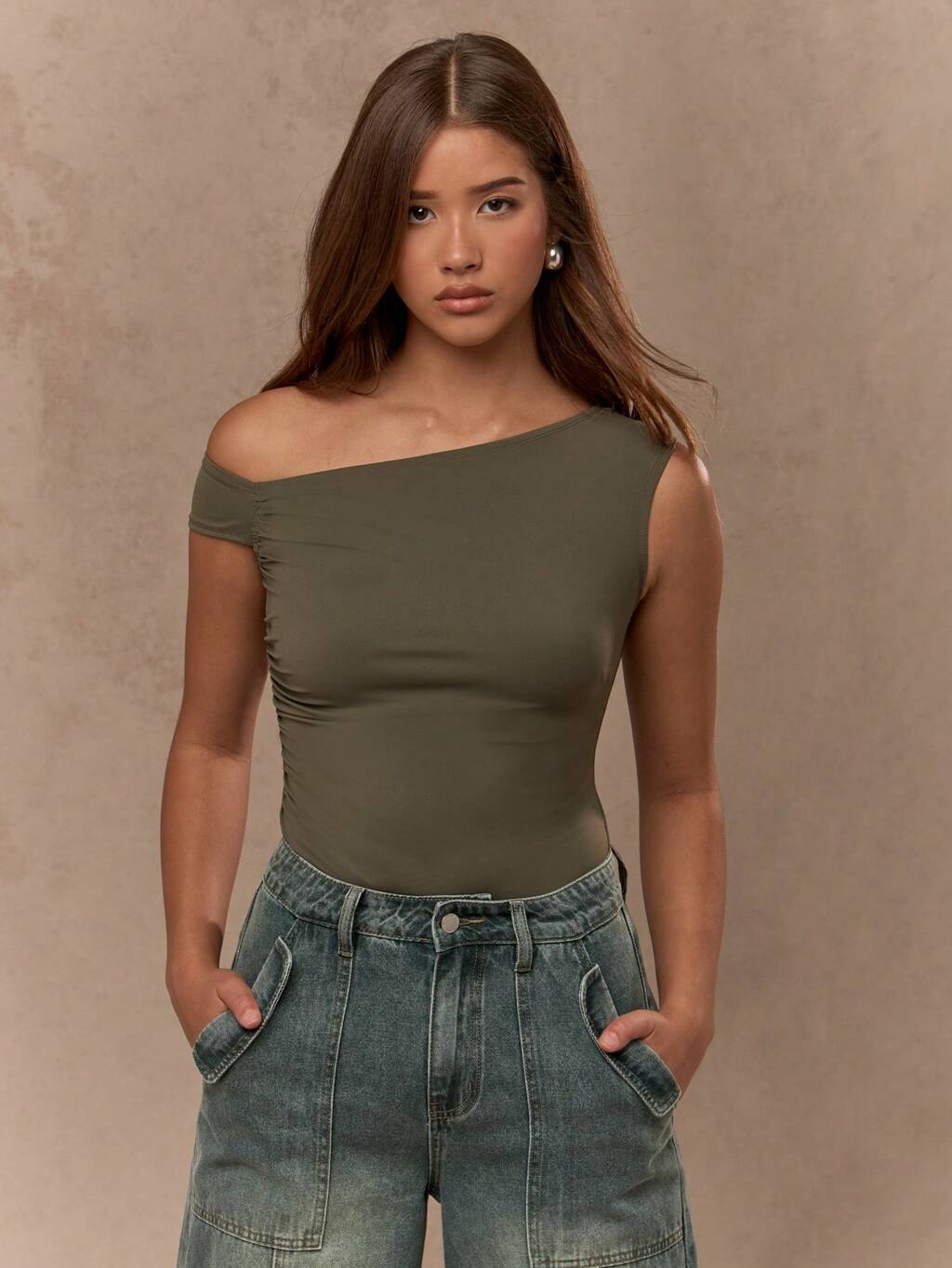 MISSGUIDED Combinaison asymétrique vert olive pour le jour de la St-Patrick, épaules dénudées, moulante et extensible, pour une soirée dansante, célébration des fêtes irlandaises, tenue festive avec porte-bonheur