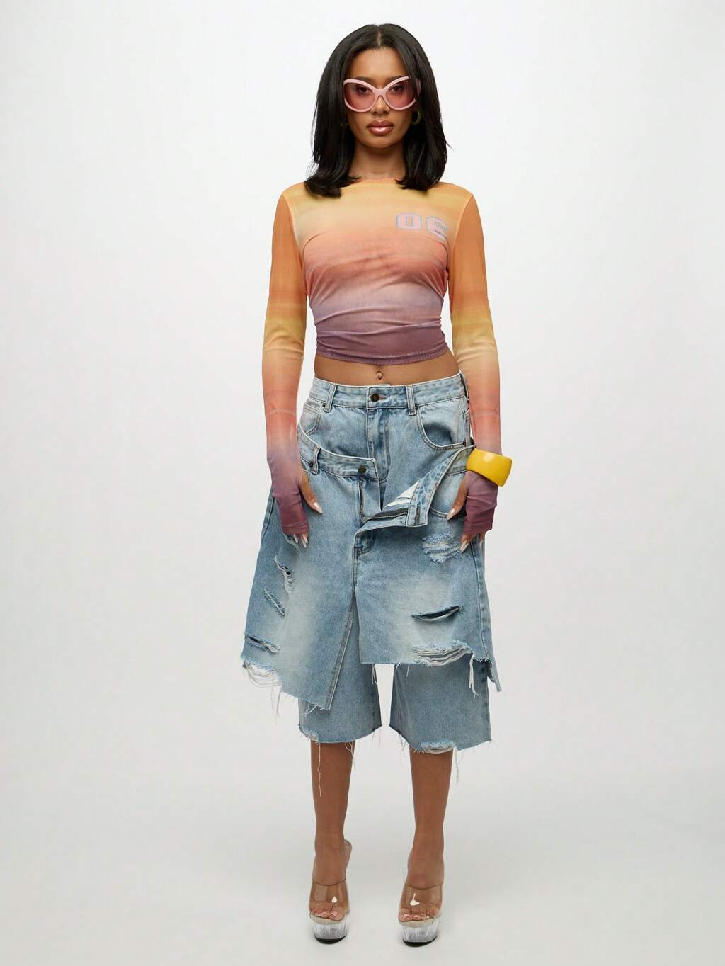 SUMWON WOMEN Top court à manches longues en maille, numéro de varsité Y2K, coupe slim, dégradé de coucher de soleil