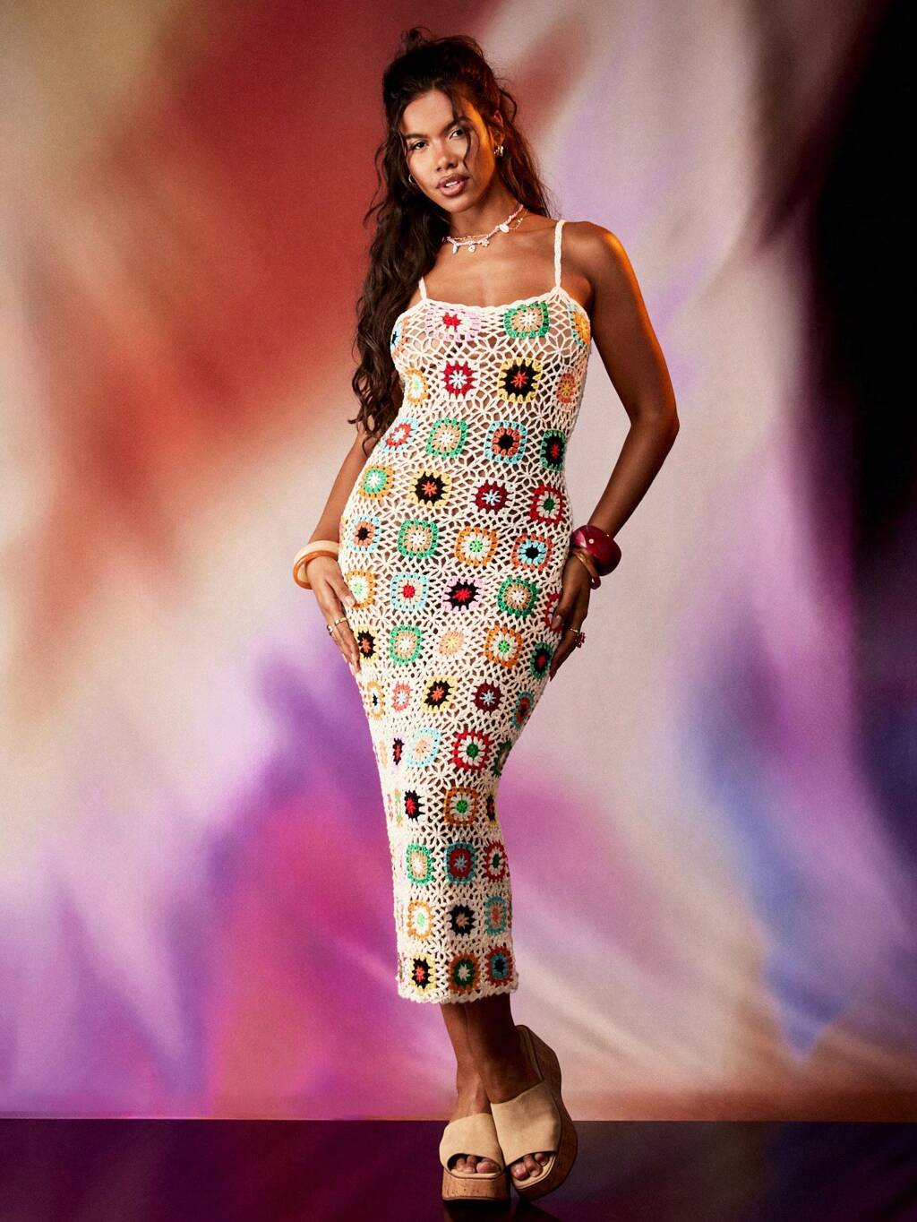 MISSGUIDED Robe ajustée à bretelles spaghetti en crochet fait main, motif floral, motif Granny Square