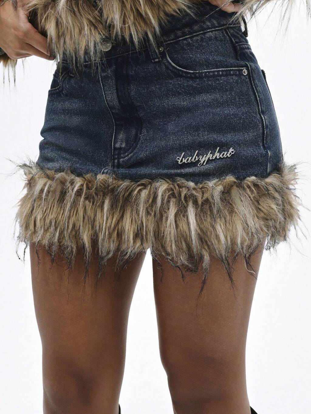 BABYPHAT Jupe mini en jean avec garniture en fausse fourrure, détails de franges ornées, taille haute, longueur courte, pièce mode d'hiver et d'automne