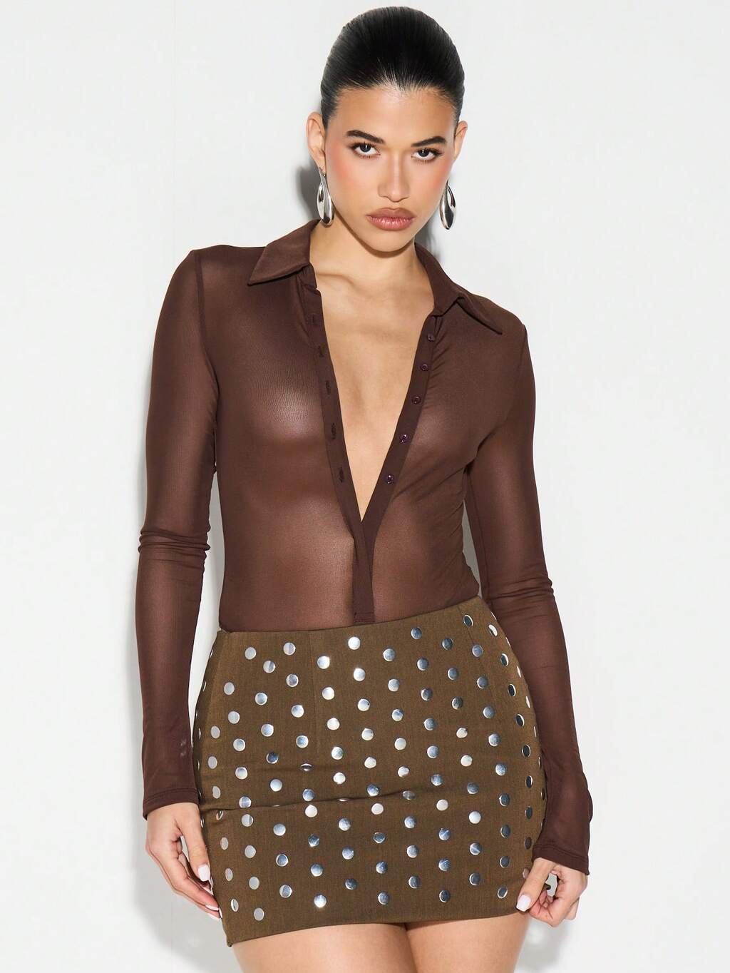 KIZN Mini-jupe marron chocolat cloutée avec des clous métalliques circulaires, taille haute, moulante, pour soirée, sortie en boîte de nuit, mode