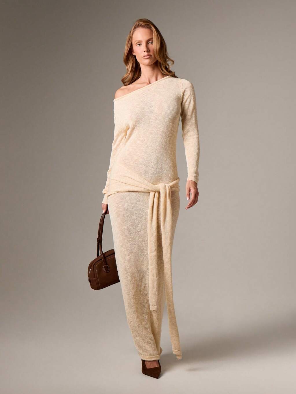 KIZN Abito mini in maglia con spalle scoperte, effetto consumato, texture a costine e dettaglio orlo sfilacciato