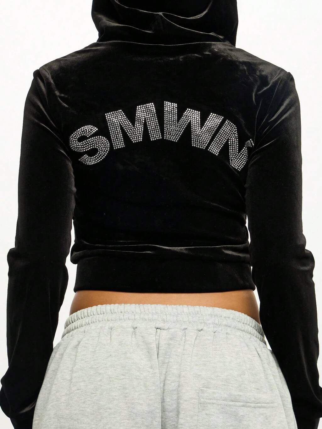 SUMWON WOMEN Felpa con cappuccio in velluto con chiusura lampo e logo in strass, felpa di lusso casual con cappuccio e laccetti