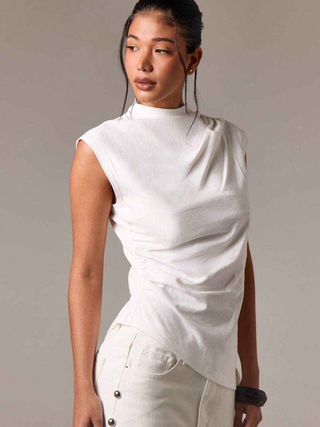 AiiRZ Top senza maniche con collo a lupetto, drappeggiato e arricciato, orlo asimmetrico, design contemporaneo, elegante per occasioni serali, moda minimalista e sofisticata