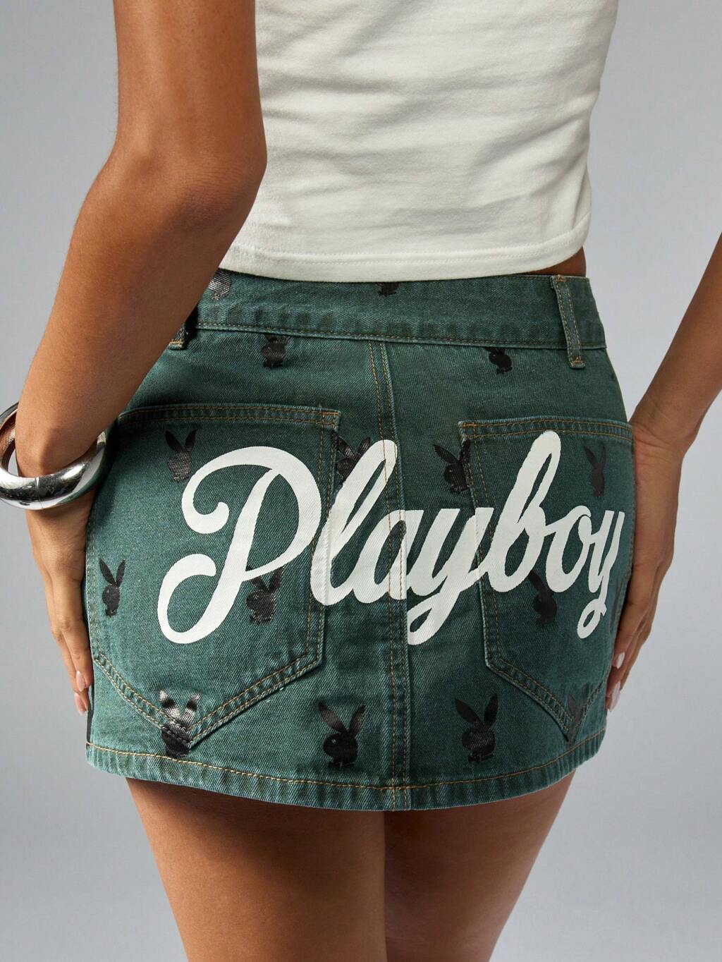 Missguided x Playboy Gonna corta in denim usurato a vita alta in stile retrò Y2K