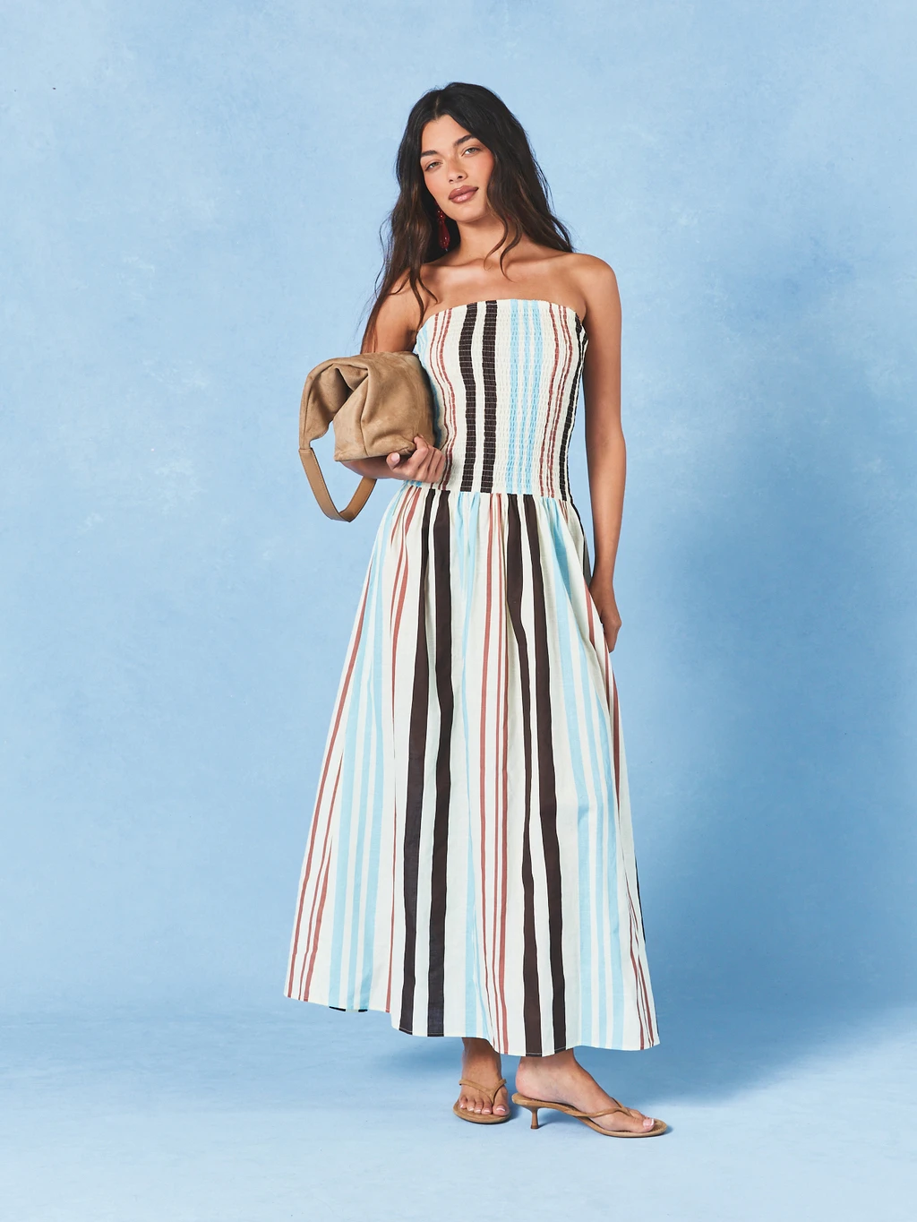 MISSGUIDED Abito lungo a righe senza spalline con corpetto arricciato e nodo anteriore